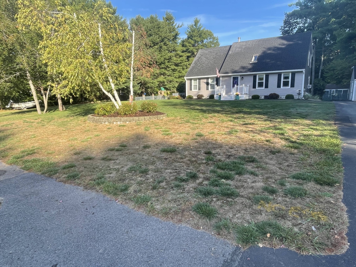 When Theresa and Sean reached out to Mighty Lawn in September of 2025 their Hanson lawn was patchy, filled with crabgrass, and had been and had suffered significant drought damage. They told a story about how their lawn had been lush and vibrant that spring, how they were excited when they hired Lawn Doctor to take care of it, and how they were disappointed when their lawn died over the summer. They felt abandoned by their former service provider, who they said did not give them watering guidance that could have prevented their lawn from dying in the summer, and failed to provide a plan to fix their lawn once the damage had occurred.