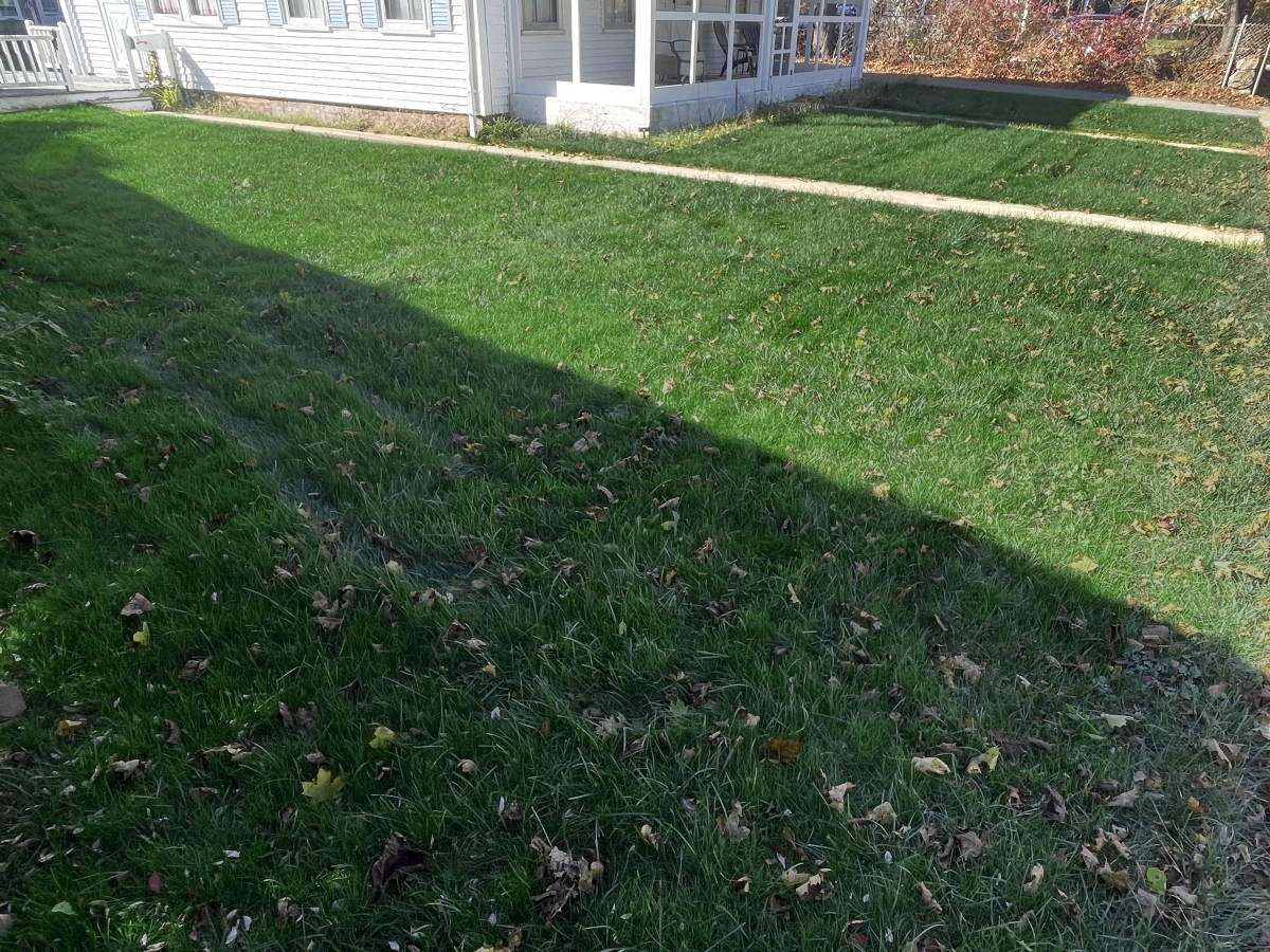 Two applications of weed control were performed in the months of July and August, followed by an aeration and slice seeding project in early September. For this project, we used 30 pounds of our proprietary sunny grass seed mix, consisting mostly of turf type tall fescue. The lawn was watered appropriately, twice per day for the following 25 days. An application of starter fertilizer was applied 2 weeks after the renovation was performed, as to allow time for seed germination before adding nutrients to the soil. The result was a lawn that became free of weeds, and now consists of a thick, dark green carpet-like stand of turf. The before and after pictures show Alex's lawn on the day of the renovation, and 6 weeks later when the winterizer fertilizer was applied.