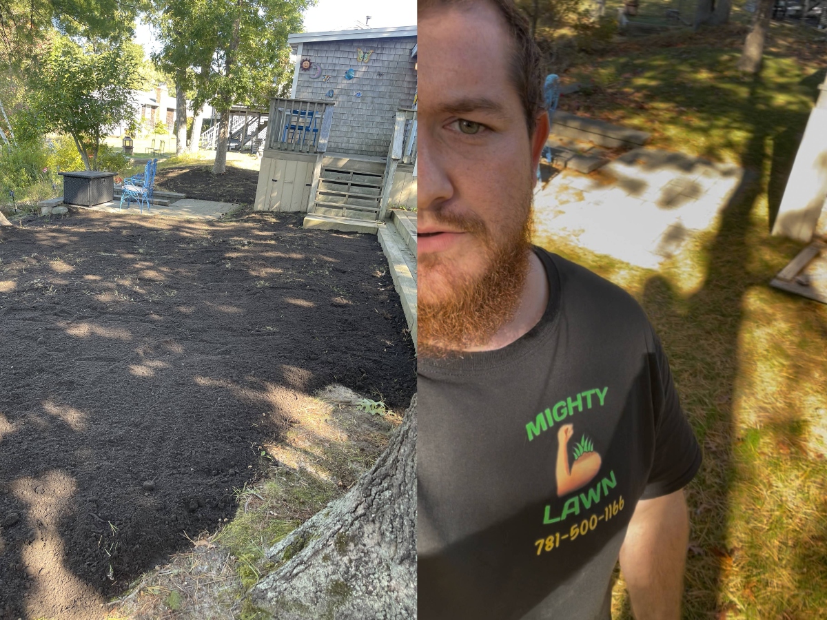 When Pina was referred to Mighty Lawn in late September by one of her relatives who uses our service. Her Wareham lawn was sparse, the soil was sandy, and parts of the lawn were located in both heavily shaded and highly sunny conditions. Additionally, the lawn is on a hill that slopes down into a lake, providing runoff challenges to installing soil and seed. Upon initial inspection, it was determined that adding 3-4 inches of composted loam topdressing, and seeding would be a more efficient and long-term solution than laying sod due to the shady environmental conditions.